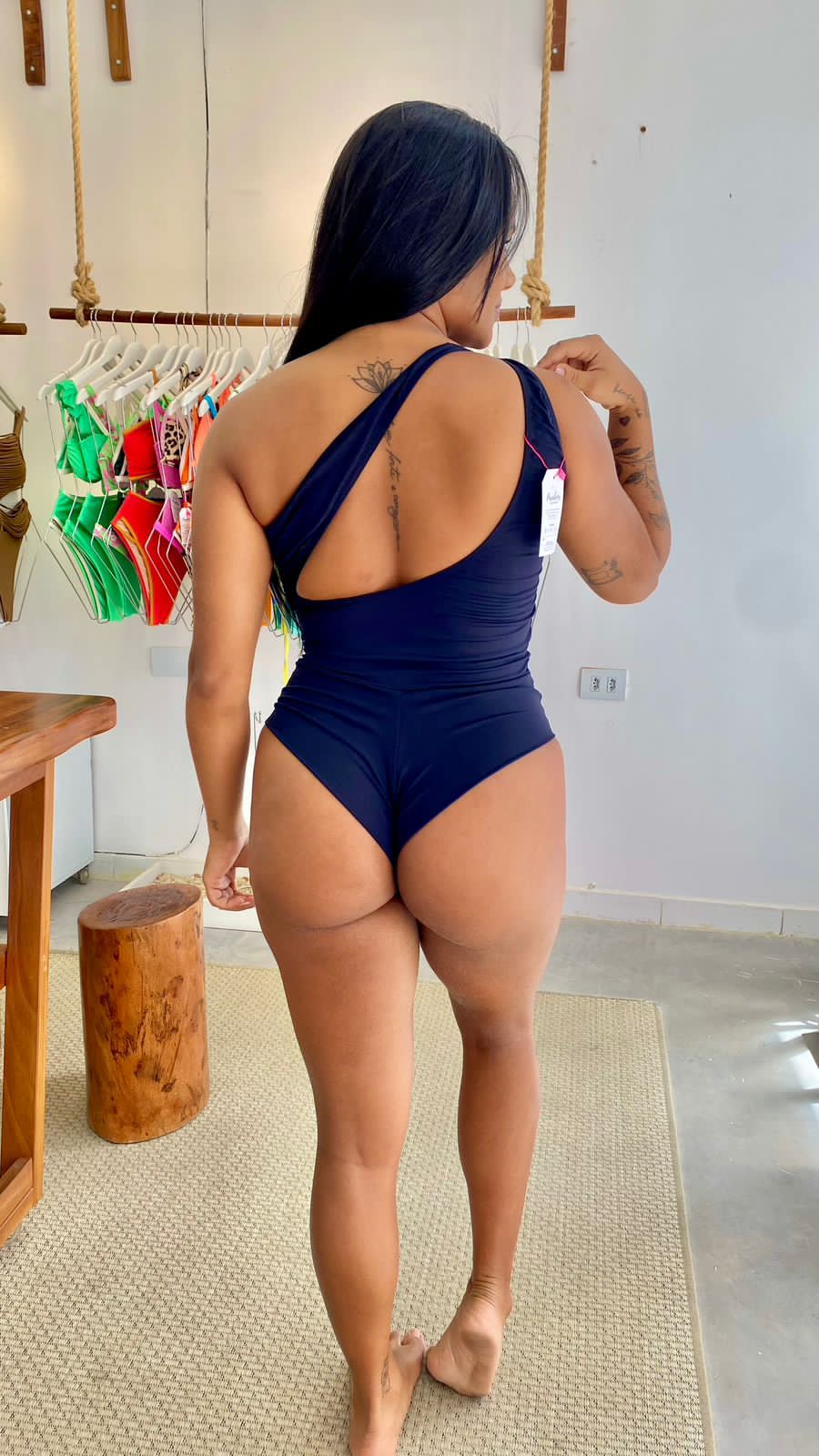 Maiô body rosa meio ombro todo em recortes de tela com decote nas costas